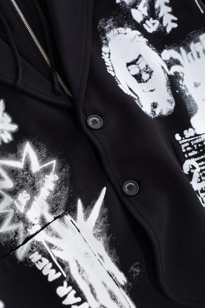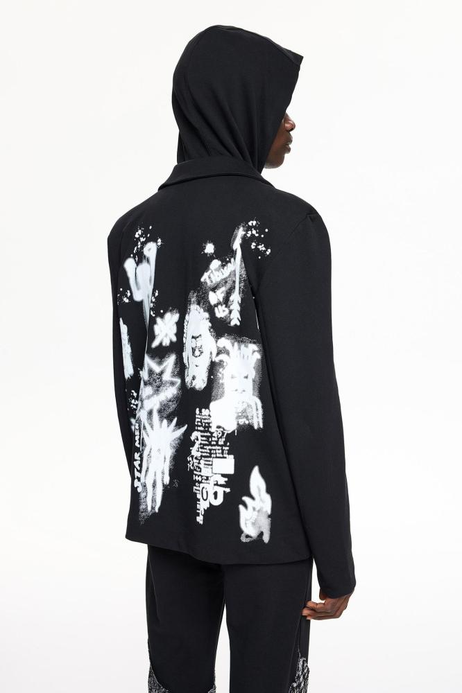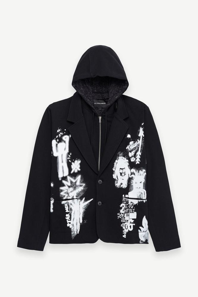 بليزر رجالي أسود مصنوع من قطن 100٪ بجودة عالية، بقصّة عادية مريحة تناسب اللبس اليومي. يتميز بغطاء رأس مع رباط، ياقة بفتحة مزدوجة، إغلاق بزر أمامي وجيوب جانبية عملية. تفاصيل الطباعة الأمامية والخلفية مع شعار Les Benjamins على الظهر تمنحك إطلالة شبابية مميزة.