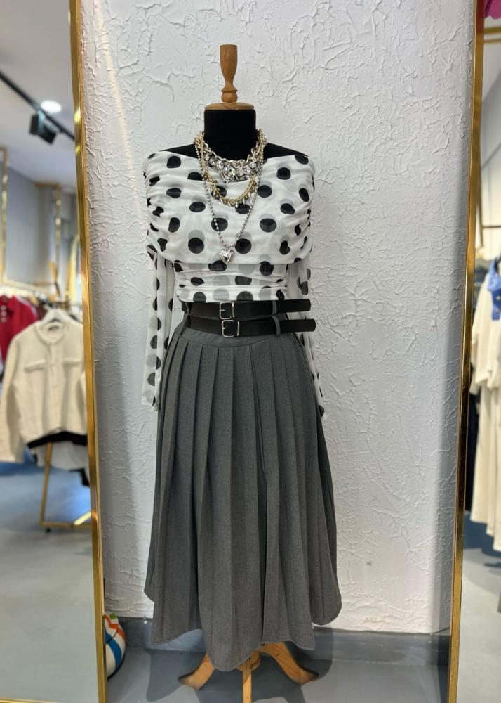 - تصميم مطوي: كسرات دقيقة تمنح التنورة مظهراً فريداً وأنيقاً.