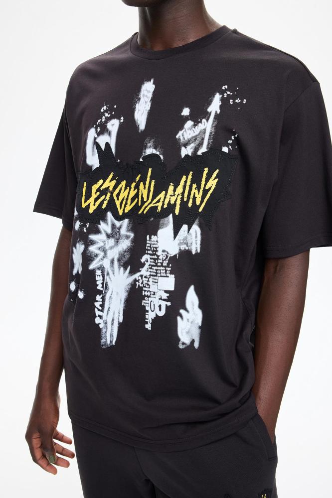 هالتي شيرت من Les Benjamins يجمع لك بين الراحة والأناقة بعصرية لا تقاوم، مصنوع من قطن تركي 100% يعطيك نعومة وتحمل طول اليوم. الرقبة الدائرية المضلعة تضيف لمسة كلاسيكية تناسب كل المناسبات، مع طباعة جرافيكية موسمية تطلع على ذوق الشباب السعودي اللي يحب يبرز تميزه. التطريز الأمامي يعكس جودة المنتج ويعطيه فخامة إضافية، مقاس العارض متوسط وطوله 188 سم، يناسبك لو تحب التيشيرت المريح والأنيق بنفس الوقت. 🖤