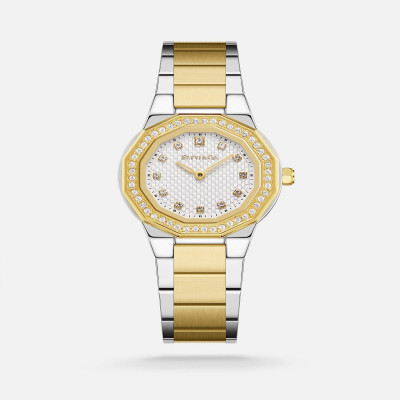 نوع الإطــار: ستيل, لون الإطــــار: فضي وذهبي , مقاس الإطـار:30 MM , نوع الســوار: ستيل , لــون الســوار: ذهبي و فضي , لون الميناء: فضي , مقاومة المـــاء: نعم