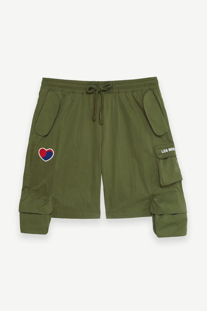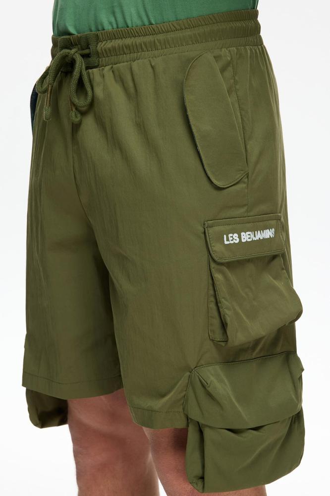 شورت Les Benjamins أخضر يجمع بين الراحة والأناقة في كل تفصيلة. خصر برباط مرن يوفر حرية الحركة، والجيوب العملية تتضمن جيب منفوخ على الظهر، جيبان عند الركبة وجيب على الجانب الأيسر. تزينه علامة تجارية مطبوعة ومنسوجة على الجهة الأمامية، وشعار مطرز موسمي على شكل لفافة على الظهر، مع طباعة رقمية على السجادة لإضافة لمسة عصرية فريدة.