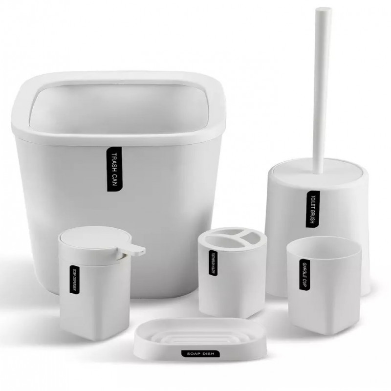 - تتضمن المجموعة: سلة مهملات ، وفرشاة مرحاض ، وموزع غسول ، وحامل فرشاة أسنان ، وكوب غرغرة ، وصحن صابون