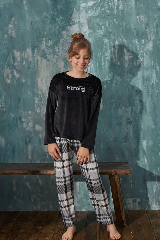 طقم بيجامة بناتي مخملي حصري منقوش باللون الأسود من Pijamaevi