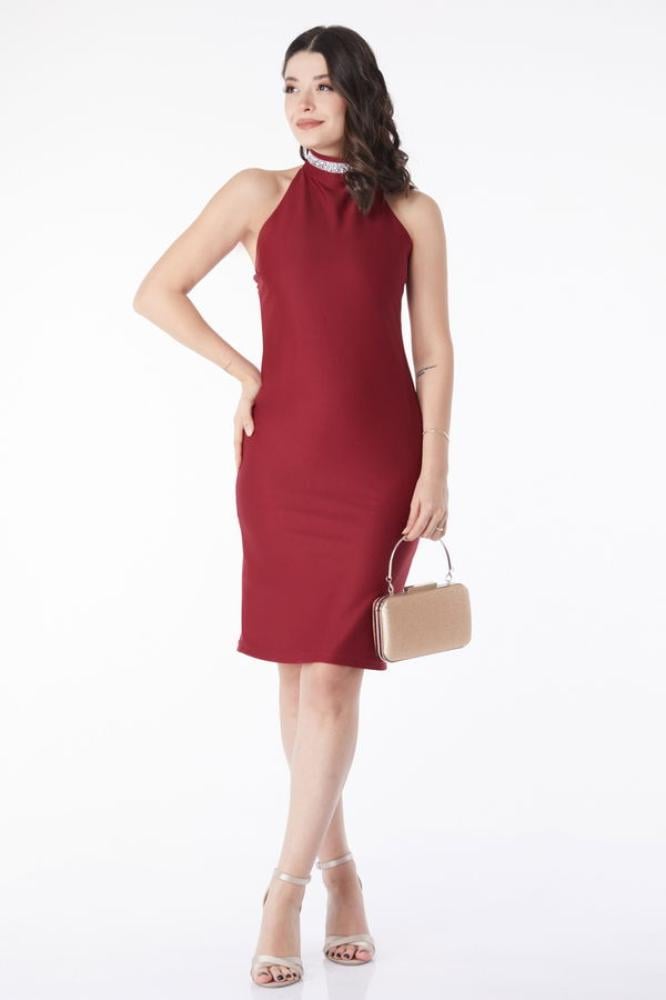 فستان سهرة نسائي بفتحة رقبة دائرية مستقيمة ومزين عنابي من TOFISA
