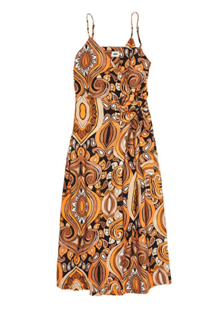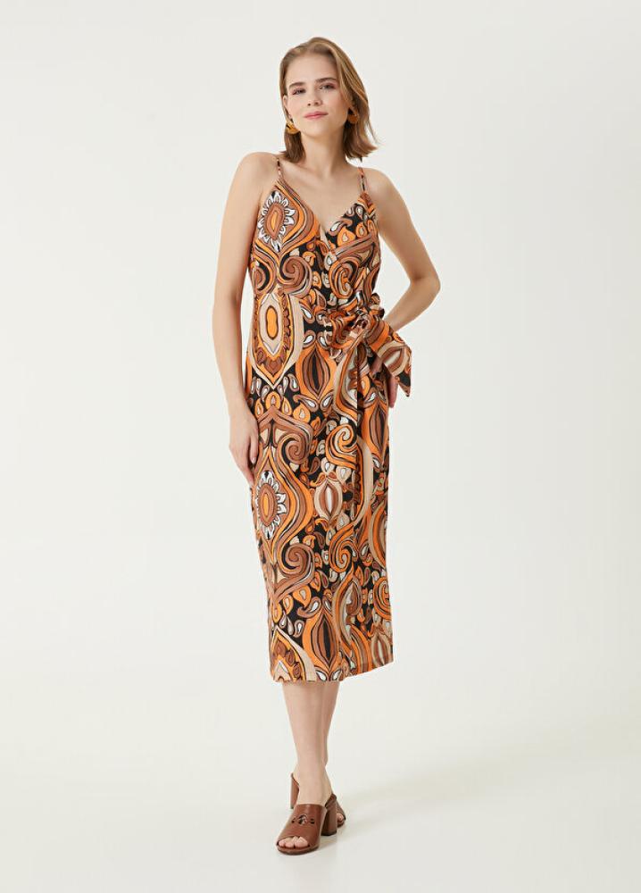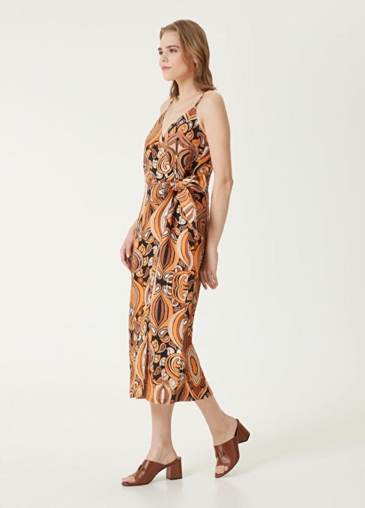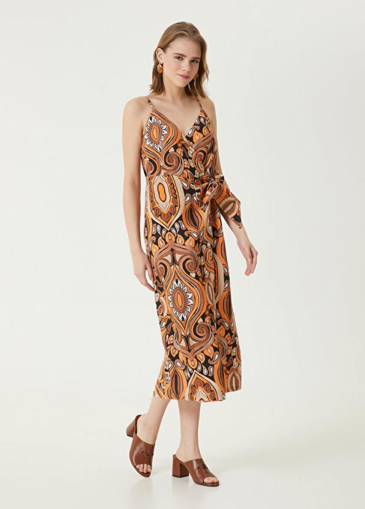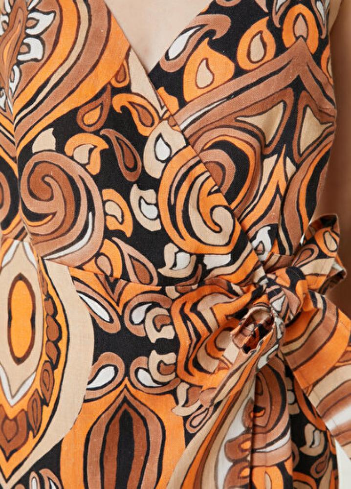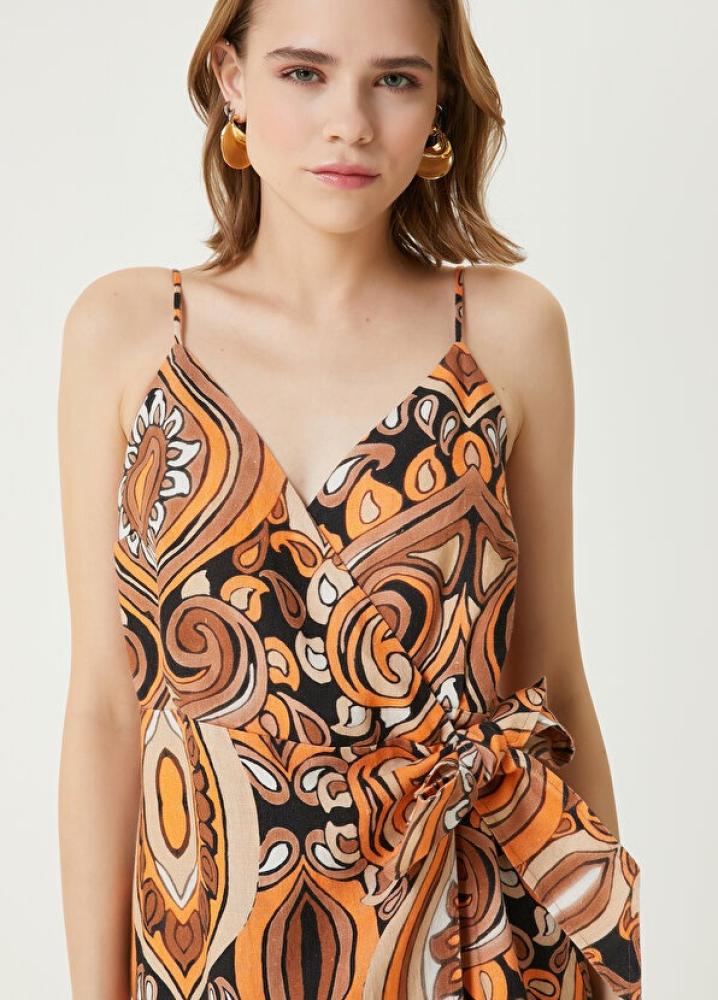 فستان بياقة على شكل V، حمالات رفيعة، طول متوسط، لف من الكتان، خصر مربوط ، منقوش