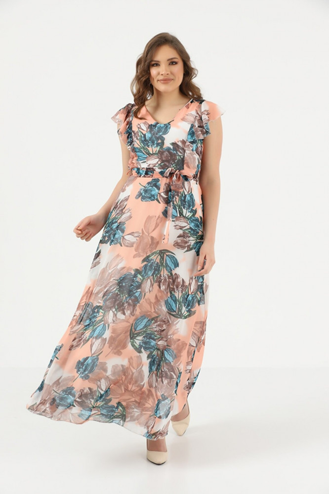 فستان نسائي بيج فاتح أحمر طويل شيفون منقوش برقبة على شكل V وأكتاف من الشيفون المنقوش من ceylen