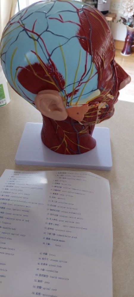 يعرض تفاصيل الرأس والرقبة اليمنى للإنسان ، بما في ذلك العضلات السطحية المكشوفة للوجه والأوعية الدموية السطحية والأعصاب والنكبات الوجهية وفروة الرأس ، الهيكل الداخلي للجهاز التنفسي العلوي وقسم القوس من العمود الفقري العنقي