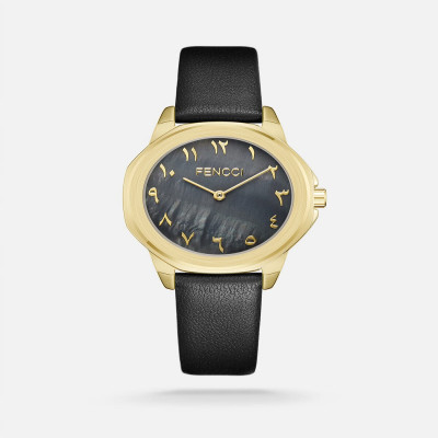 تصميمها الأنيق يجمع بين سوار جلدي أسود فاخر وميناء أسود كلاسيكي بأرقام عربية وإطار ذهبي عريض.